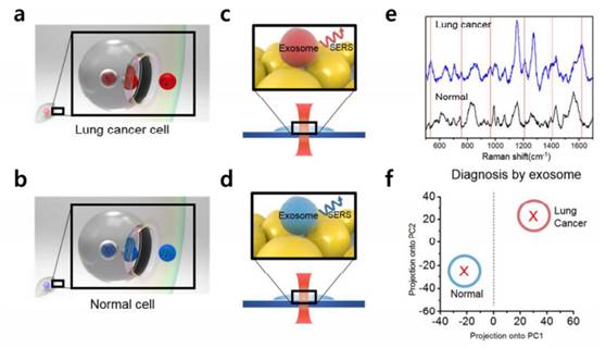 不同于传统方法读取不同的峰位置和频谱幅度,通过主成分分析(PCA)对外泌体的整个SERS光谱进行分析。通过这种模式分析,将肺癌细胞衍生的外泌体明显区别于正常细胞衍生的外泌体,灵敏度为95.3%,特异性为97.3%。此外,通过分析PCA结果,研究人员认为这种差异是由来自肺癌细胞衍生的外泌体的SERS信号中的11个不同点引起的。这一结果为外泌体作为癌症标志物对肺癌进行实时诊断和分类铺平了道路。